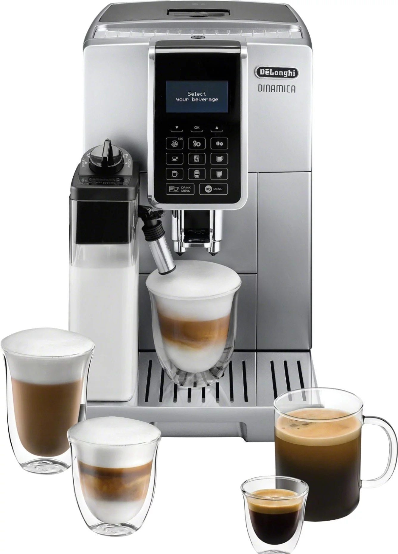 De’Longhi Dinamica Espresso Machine with 15 bars of pressure and Latte Crema Fully Automatic Milk Frother Silver