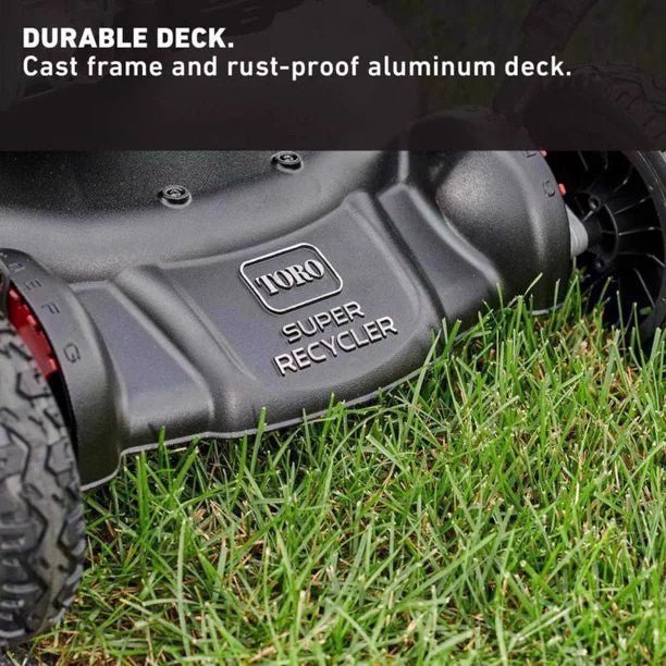 We?re not going to lie? you?re gonna get a lot of double-takes when you?re mowing with this suave-looking bad boy. Little do they know this hungry herbivore is a wiz at helping protect the earth, reducing your water and fertilizer use with the Super Recycler?s Cutting System. Take mowing creature comforts to the next level with flex Handle suspension and hassle-free maintenance. When you?re done, lock and store your Toro practically anywhere in your garage or shed with SmartStow. And you can rest easy knowing Toro stands behind its mowers with a 5-year full warranty.